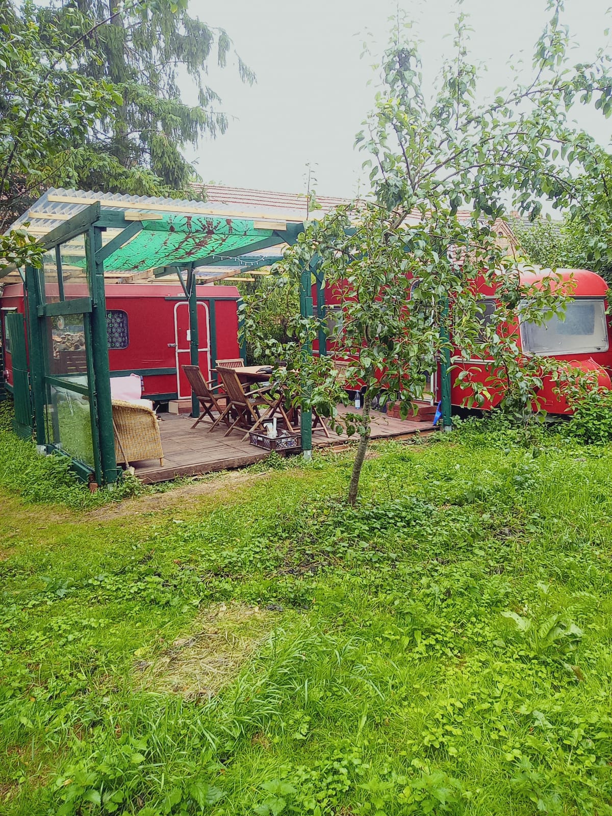 Zwei oldtimer Wohnwagen in einem idyllischen Garten