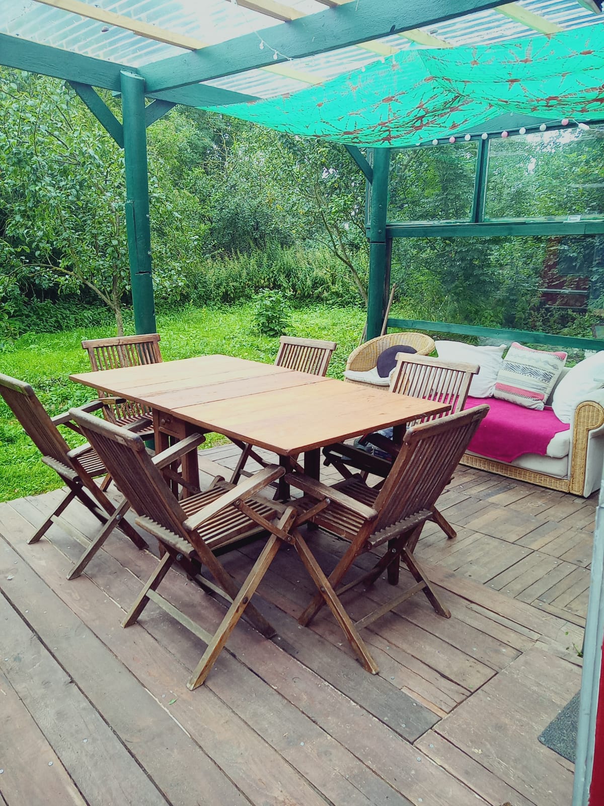 überdachte Holzterrasse mit Esstisch