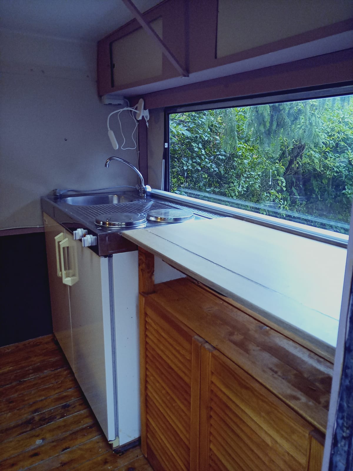 Küchenwagen ist ausgestattet mit Herd, Wasserkocher, Kühlschrank,