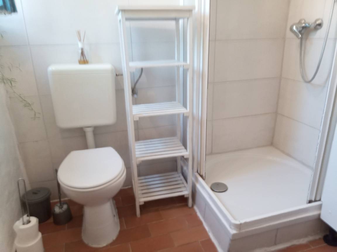 ein Bad mit Dusche und warmen Wasser.