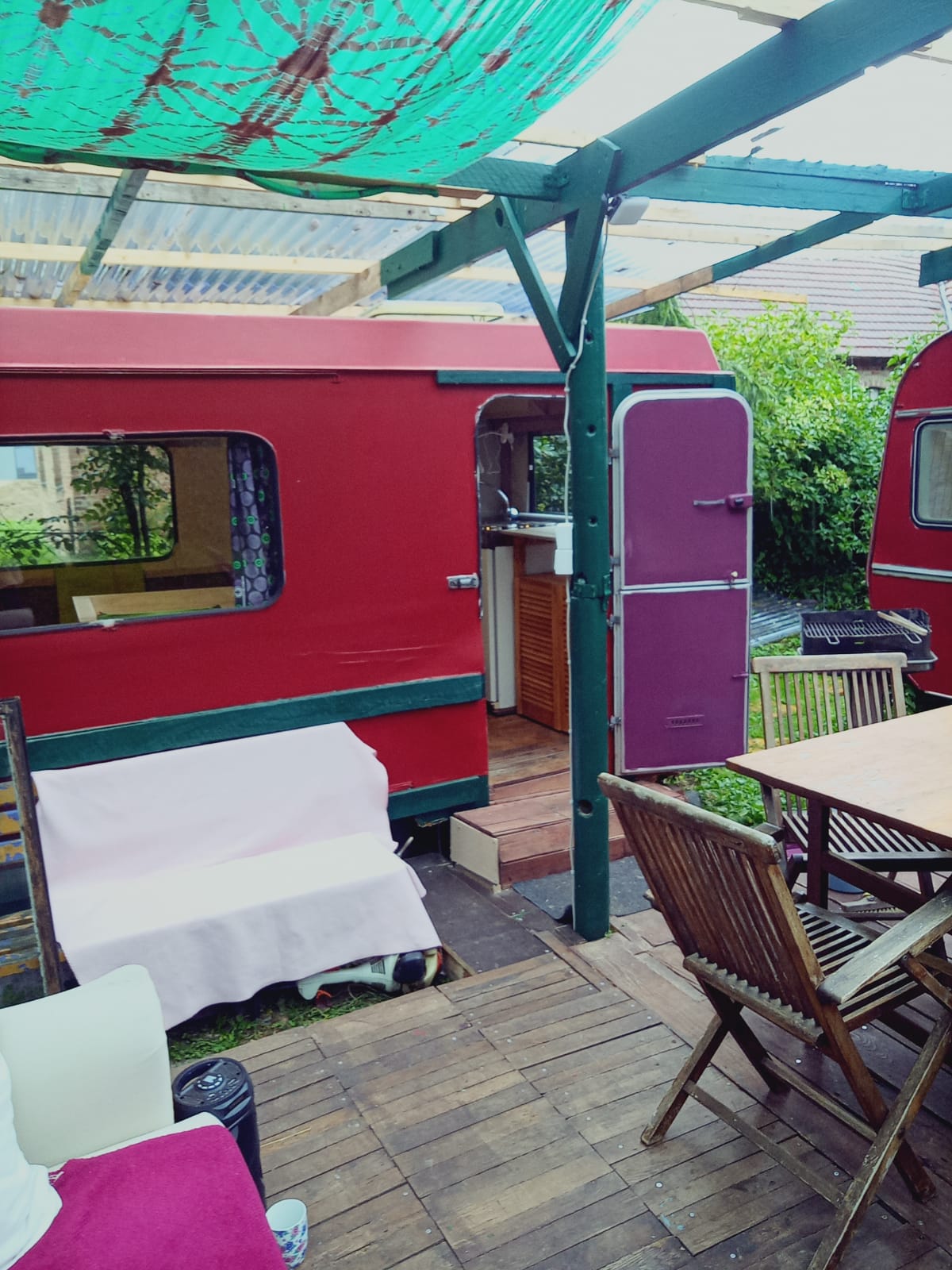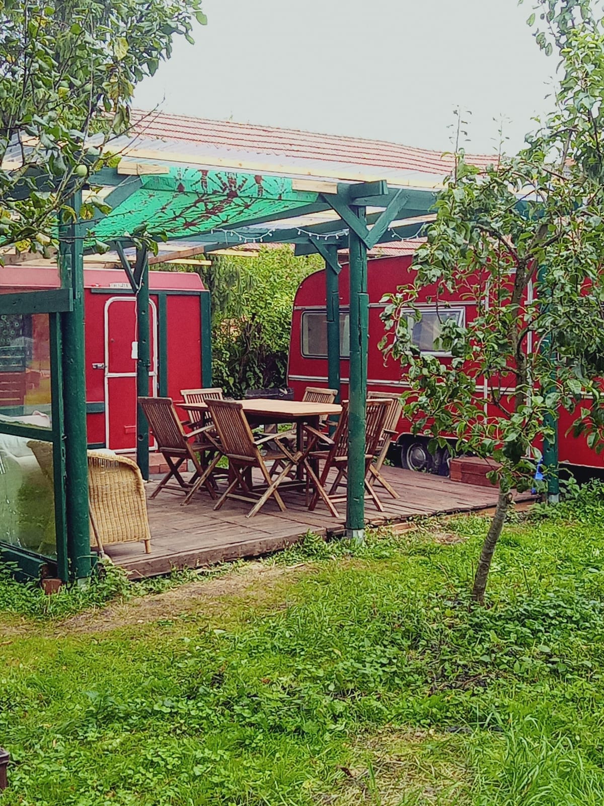 Zwei oldtimer Wohnwagen in einem idyllischen Garten