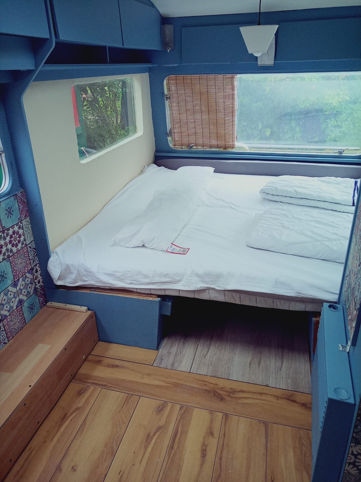 Ein Wohnwagen mit 2 Doppelbetten zum Schlafen